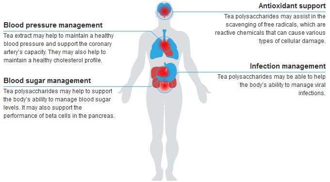 The most common uses of tea polysaccharides generally relate to blood sugar levels and the cardiovascular system. Additional uses are typically due to the antioxidant effects of tea polysaccharides.